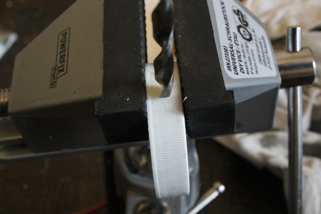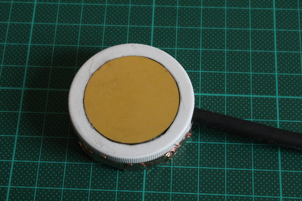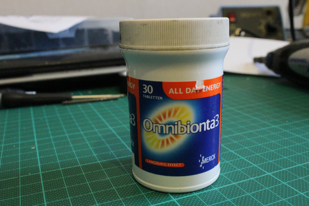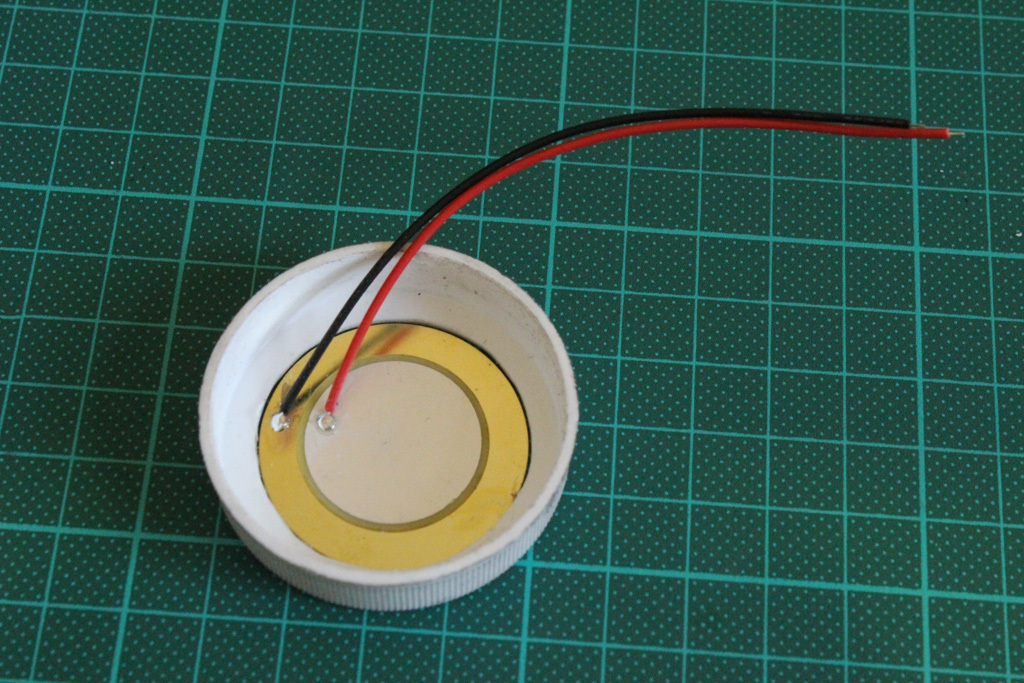 I used the lid from this vitamin bottle as a container for the Piezo element. It’s a soft plastic yet pretty sturdy and easy to work on. When making a test mic without it, I noticed it was way to fragile. The only thing you need to keep in mind is that the Piezo disc needs to sit flush with its container so it can make actual contact with the object you are going to record. Just drill a hole in the side for the audio connection. And to cut out the circular shape I used a Dremel with a routing bit.