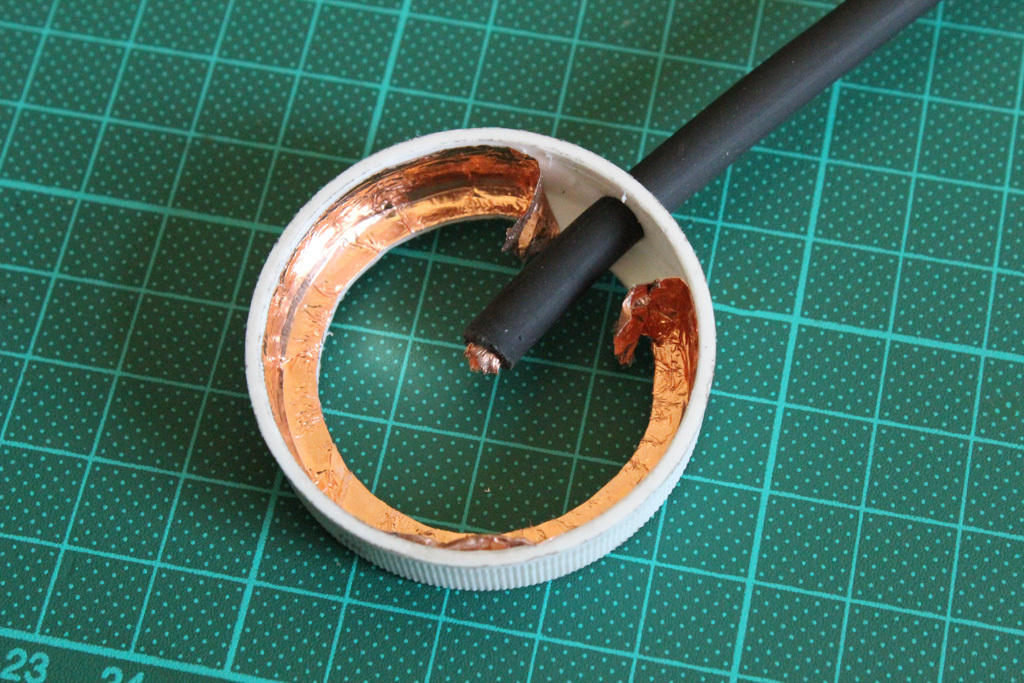 The shielding wire is connected to the copper adhesive, positive wire (red) to the inner disc and the negative wire (translucent) to the outer disc.