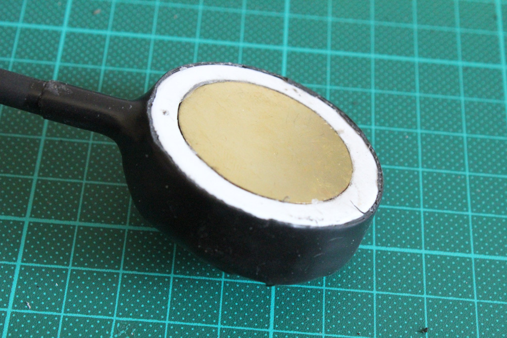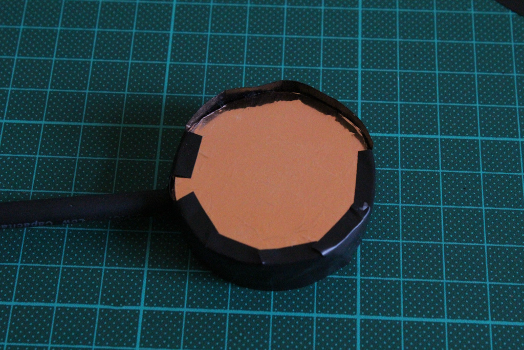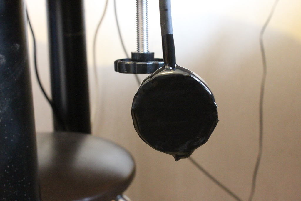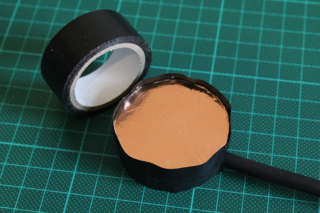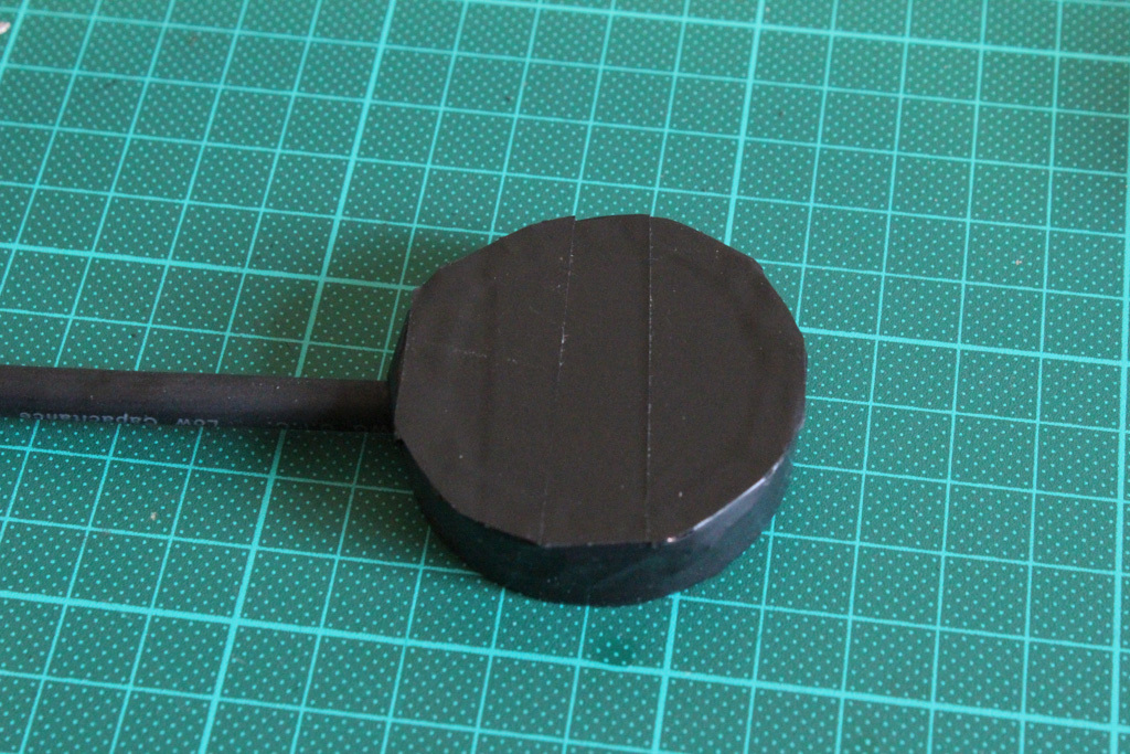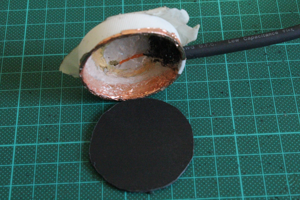 Then I taped off everything with some black electrical tape before I treated the whole mic with a fantastic product called Plasti Dip. I used a thin piece of plastic sheet to temporarily cover the contact side because it would make it easier to remove the Plasti Dip from the Piezo disc later.